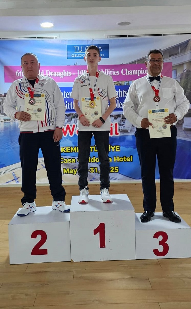 В Турции (Кемер) в период с 19 по 30 мая 2025 года проходил чемпионат мира по шашкам-100 среди лиц с ограниченными возможностями (спорт лиц с ПОДА, спорт глухих, спорт слепых).