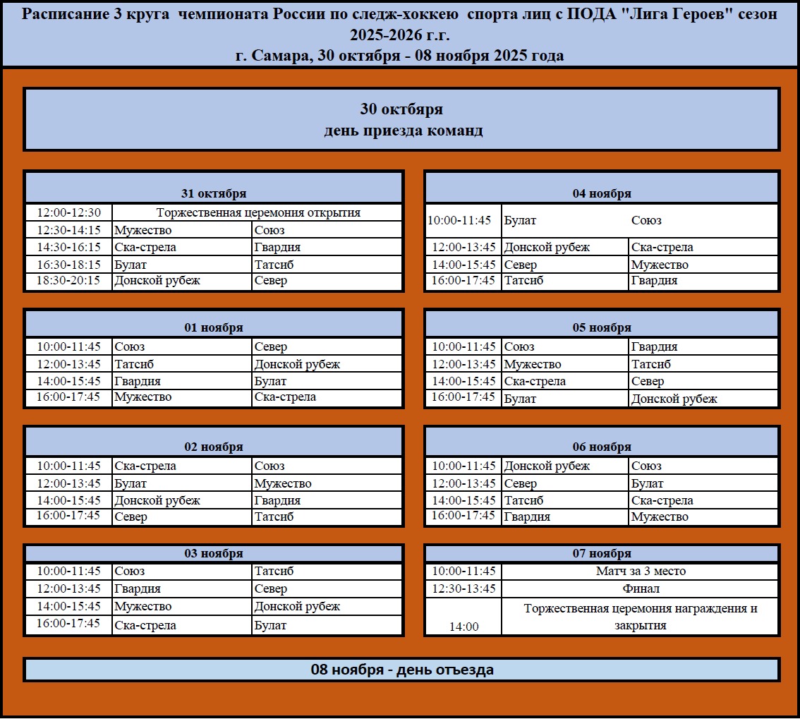 С 30 октября по 8 ноября в Самаре на базе спортивного комплекса «МТЛ Арена 2» состоится третий круг чемпионата России по следж-хоккею в дивизионе «Лига героев» для спортсменов спорта лиц с поражением ОДА
